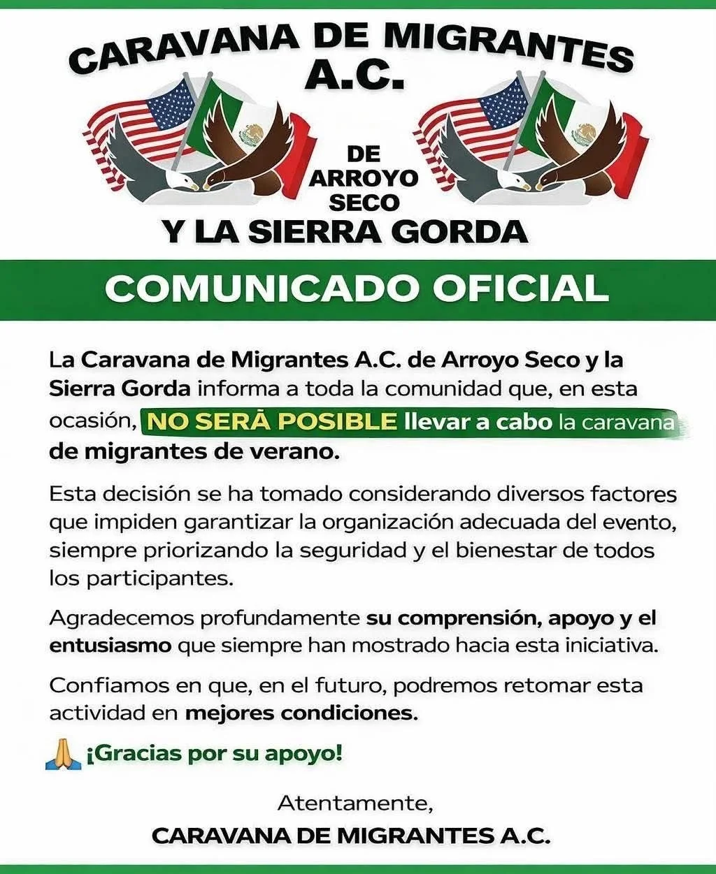 La organización Caravana de Migrantes A.C. informó que este 2026 no se realizará la tradicional caravana de verano que reúne a paisanos originarios de Arroyo Seco y de la región de la Sierra Gorda. La decisión fue anunciada mediante un comunicado oficial.