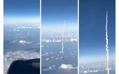 El inusual registro desde el aire permitió observar el ascenso del cohete en pleno vuelo, generando gran interés en redes sociales por la magnitud del momento y la cercanía de la toma.