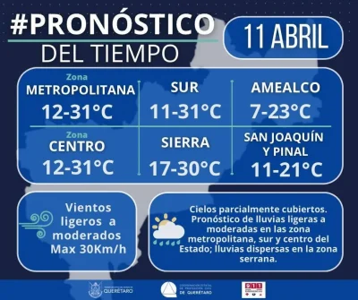 El pronóstico también indica cielo parcialmente nublado durante el día, con temperaturas que oscilarán entre los 12 y 31 grados en la zona metropolitana y centro. En el sur se prevén valores similares, mientras que en Amealco se registrarán temperaturas más frescas, de entre 7 y 23 grados.
