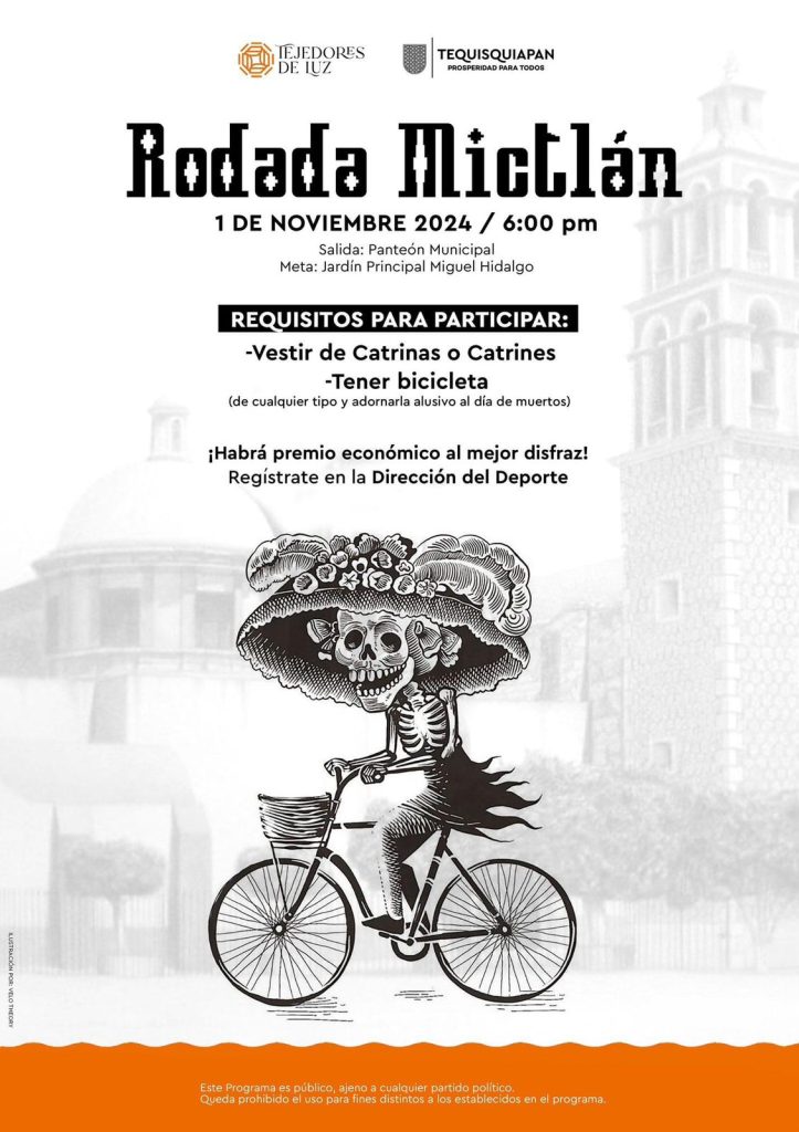 El municipio de Tequisquiapan a través de la Dirección del Deporte invita a todas y todos a la “Rodada Mictlán”, un paseo familiar en Bici dedicado a los fieles difuntos, en donde el disfraz más creativo tendrá un premio económico.